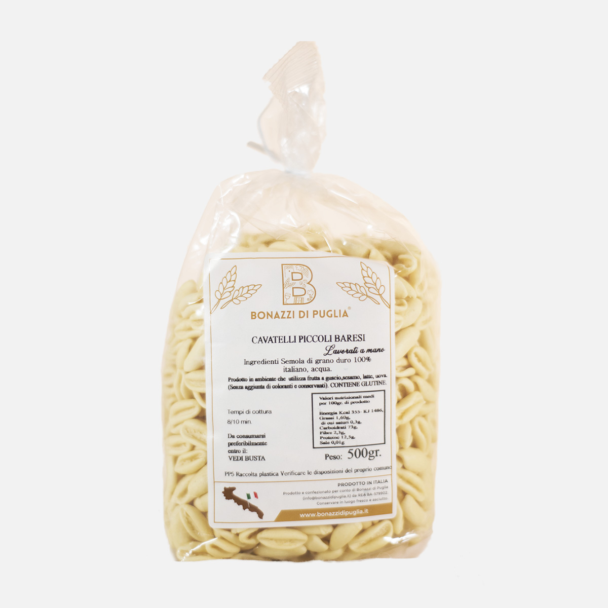 Cavatelli piccoli baresi lavorati a mano e preparati con semole di grano 100% italiano. Tipici ed unici nella forma (lunghezza 1 cm circa) si trovano solo a Bari Vecchia con il nome di “minuicchi”. Più piccoli dei classici cavatelli, sono ottimi se preparati con cozze e fagioli o altri sughi a base di carne, pesce, verdure e legumi.