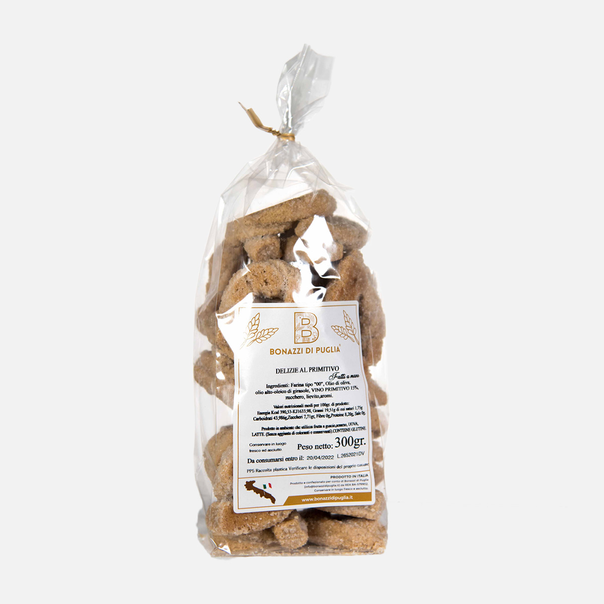 Ingredienti: Farina di GRANO tenero tipo “00”, Olio d’oliva, olio alto-oleico di girasole, VINO PRIMITIVO 15%, zucchero, lievito,aromi.