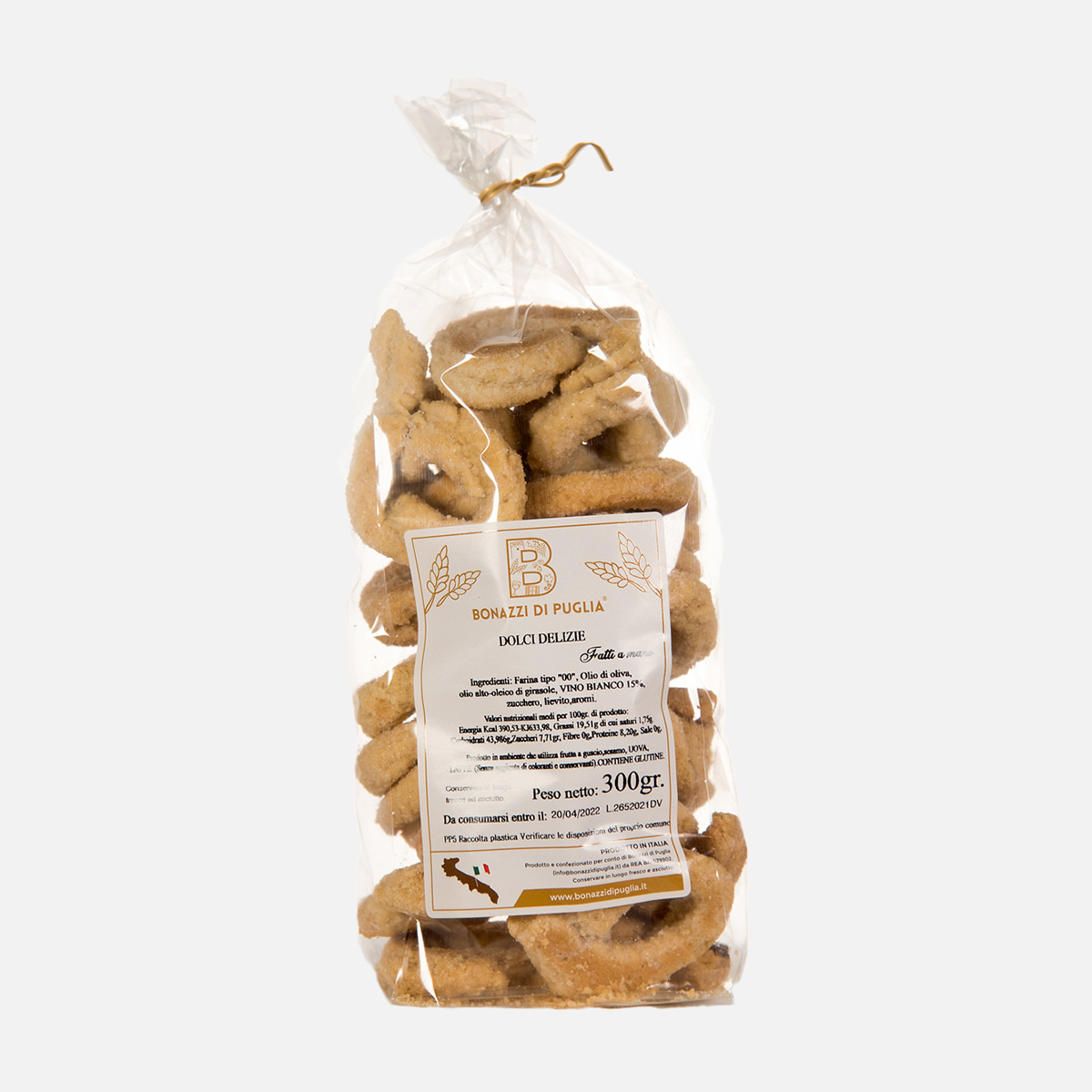 Ingredienti: Farina di GRANO tenero tipo “00”, Olio d’oliva, olio alto-oleico di girasole, VINO BIANCO 15%, zucchero, lievito, aromi.
