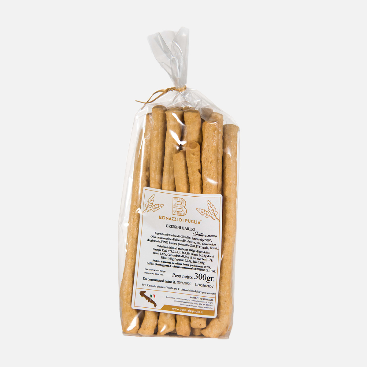 Grissini baresi fatti a mano, ideali per uno snack veloce o come antipasto.