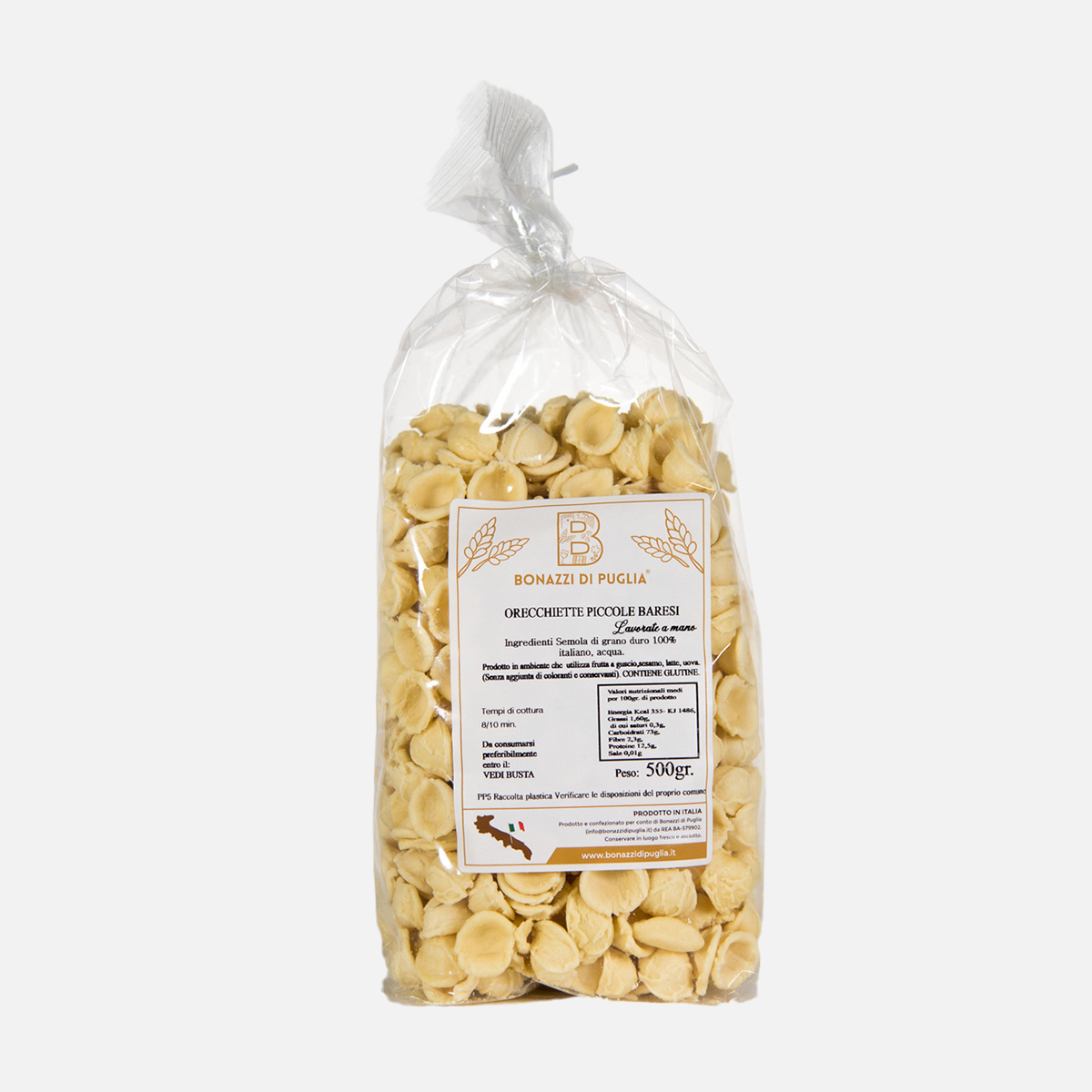 Orecchiette piccole baresi lavorate a mano e preparate con semole di grano duro 100% italiano. Tipiche per forma e dimensione (diametro 1 cm circa) si trovano solo a Bari Vecchia. Si preparano, secondo la tradizione barese, con ragù di carne, con le cime di rapa o altra verdura quale broccoli o cavoli. Ottime se preparate alla “crudaiola”, con pomodorini, cacioricotta e basilico.