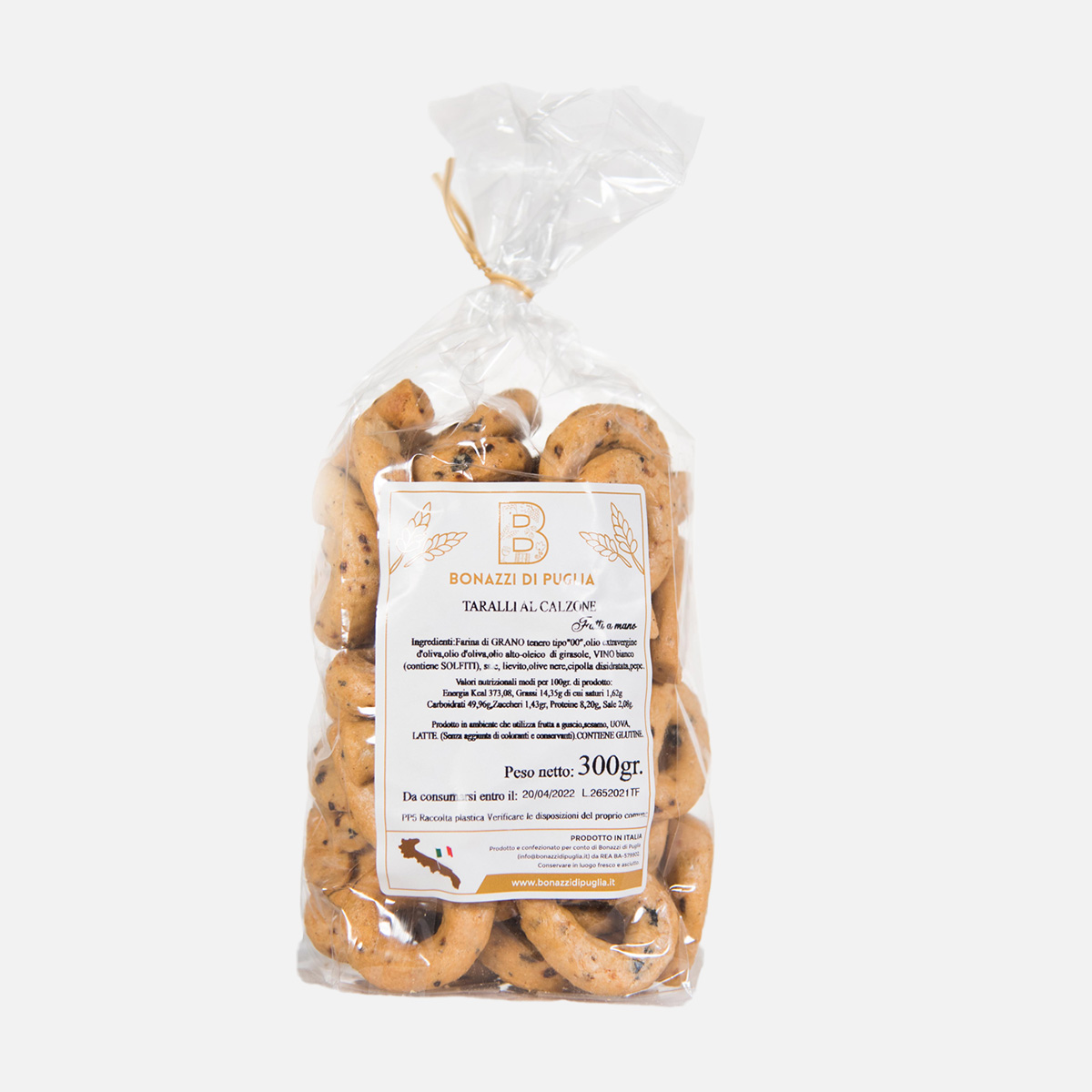 Ingredienti: Farina di GRANO tenero tipo “00”, Olio extravergine d’oliva, olio d’oliva, olio alto-oleico di girasole, Vino bianco (contiene SOLFITI), sale, lievito, olive nere, cipolla disidratata, pepe.